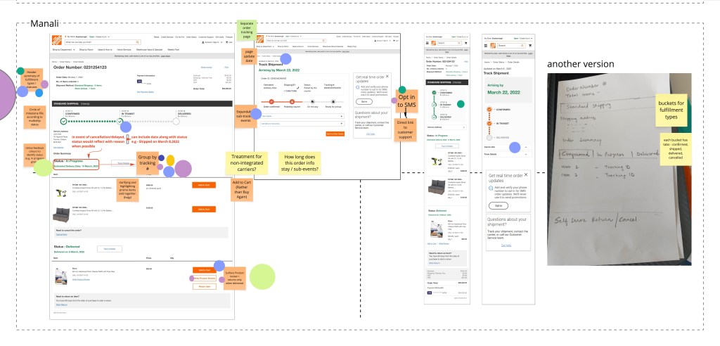 After reviewing all the sketches, the team aligned on separating the current Order Details page into two pages. The Order Details page will primarily focus on the current status of the order and self-service capabilities, while the Order Tracking page will focus on the tracking details of that order.