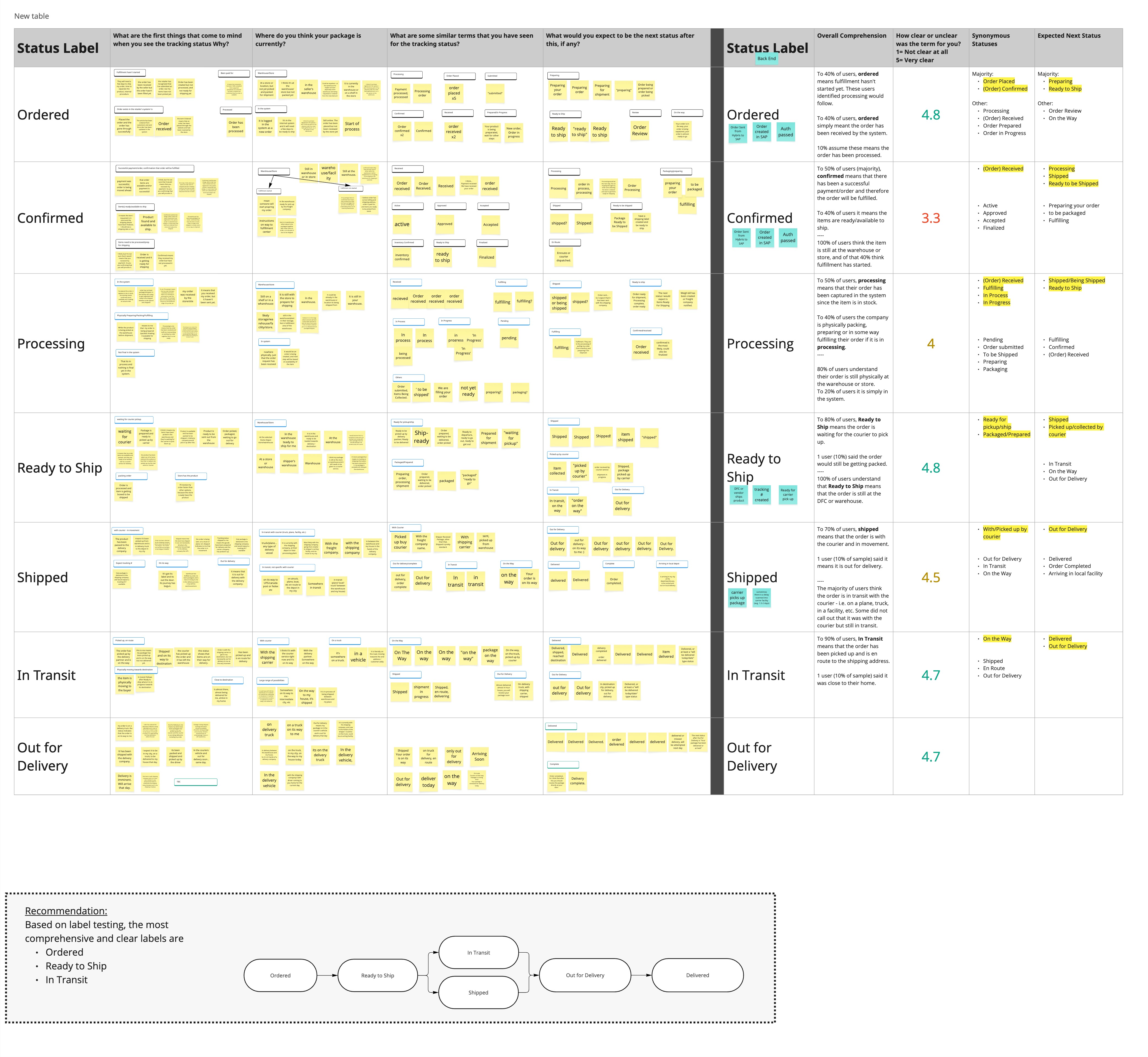 To validate the clarity of these milestones, we conducted label testing with users. Participants were shown individual milestone labels in isolation without additional context, visuals, or supporting copy and were asked to explain what they believed each label meant and what they expected to happen next. This approach allowed us to assess whether the language alone conveyed the intended meaning and progression of the order.